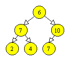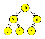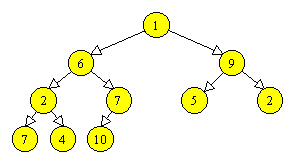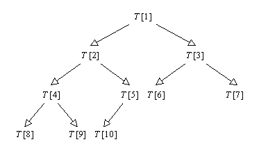 Un arbore binar cu n varfuri si de inaltime i este complet, daca se obtine din arborele binar plin de inaltime i, prin eliminarea, daca este cazul, a varfurilor numerotate cu n+1, n+2, …, 2i+1-1. Acest tip de arbore se poate reprezenta secvential folosind un tablou T, punand varfurile de adancime k, de la stanga la dreapta, in pozitiile T[2k], T[2k+1], …, T[2k+1-1] (cu posibila exceptie a nivelului 0, care poate fi incomplet). De exemplu, Figura 3.4 exemplifica cum poate fi reprezentat un arbore binar complet cu zece varfuri, obtinut din arborele plin din Figura 3.3, prin eliminarea varfurilor 11, 12, 13, 14 si 15. Tatal unui varf reprezentat in T[i], i > 1, se afla in T[i div 2]. Fiii unui varf reprezentat in T[i] se afla, daca exista, in T[2i] si T[2i+1].