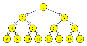 Intr-un arbore binar, numarul maxim de varfuri de adancime k este 2k. Un arbore binar de inaltime i are cel mult 2i+1-1 varfuri, iar daca are exact 2i+1-1 varfuri, se numeste arbore plin. Varfurile unui arbore plin se numeroteaza in ordinea adancimii. Pentru aceeasi adancime, numerotarea se face in arbore de la stanga la dreapta (Figura 3.3).